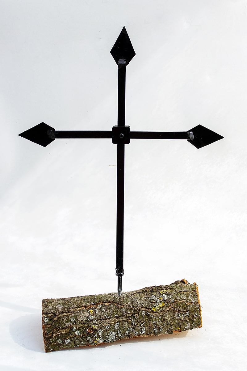 Kézzel megmunkált fémkereszt – fényes fekete lakkal bevonva, védve így a rozsda ellen.